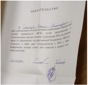 Ларец открывается просто. Если судить по содержания добровольного «Обязательства» некий Снигирев Денис Леонидович даёт согласие: «всячески содействовать Федеральной Службе Безопасности путём предоставления в установленном порядке, помощи сотрудникам ФСБ». Конечно, Снигирев берет на себя обязательство «сохранять в тайне факт сотрудничества с ФСБ». Но забыл Архиепископ Феодосий написанное в Библии – «все тайное, становится явным», что и подтверждает его подпись под документом.