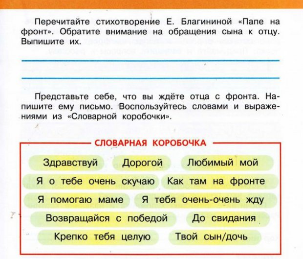 Стоит добавить, что в задачи также предлагают использовать слова и выражения из "Словарной коробочки": "Здравствуй", "Дорогой", "Любимый мой", "Я о тебе очень скучаю", "Как там на фронте", "Я помогаю маме ", "Я тебя очень-очень жду", "Возвращайся с победой", "До свидания", "Крепко тебя целую", "Твой сын/дочь".