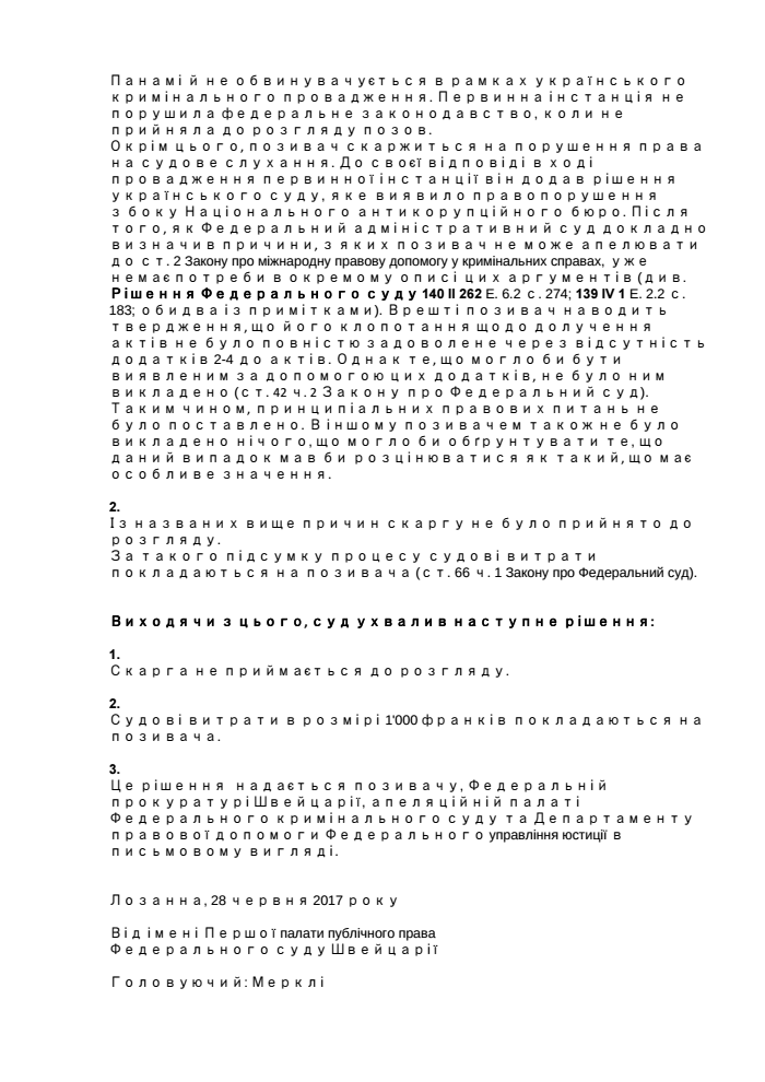 Из текста судебного решения следует, что подконтрольная Мартыненко компания «Bradcrest Investment SA» жаловалась на швейцарского прокурора и требовала его заменить, а также пыталась обжаловать решение швейцарских правоохранителей по удовлетворению запроса о международно-правовой помощи НАБУ.