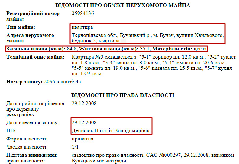Єдиним об’єктом нерухомості яким володіє дружина Наталія Денисюк – є квартира у м. Бучач. Її площа – 84 кв. м.