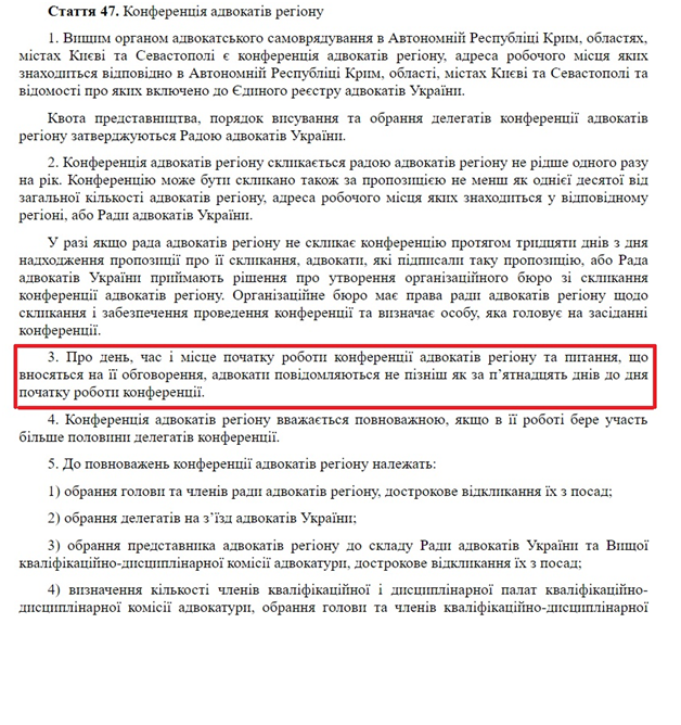 А вынесение такого вопроса с «голоса» без обоснования и веских на то причин, без предупреждения учасников конференции за 15 дней – является грубым нарушением. Об этом говорится в п. 3 ст. 47 ЗУ « Про адвокатуру та адвокатську діяльність».