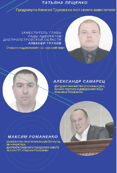 В своем заявлении к начальнику СБУ в Днепропетровской области Андрею Олейнику, они допускают причастность главы Рады адвокатов Днепропетровской области Татьяны Лещенко в том, что она способствует деятельности преступной группировки подконтрольной ФСБ РФ. А именно: либо лично продвигает на важные руководящие должности бывших регионалов, либо это делает ее заместитель Алексей Трунов, которого Лещенко лично выдвинула на пост своего зама. Цель - делегировать их в состав Высшего Совета правосудия, Высшей квалификационной комиссии судей и Квалификационно-дисциплинарной комиссии правосудия. А это значит – вернуть регионалов к власти.
