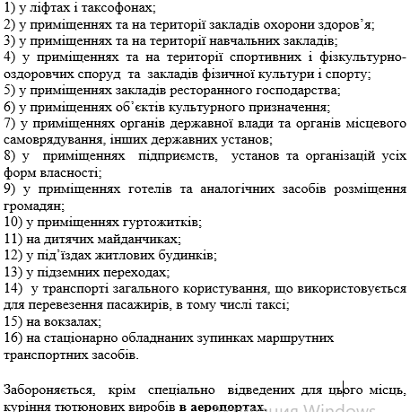 Фактически эта норма запрещает курить в любом закрытом месте. Дополнительно под запрет на курение обычных и электронных сигарет, а также кальянов подпадают такси, аэропорты, вокзалы, общежития, отели и помещения предприятий, государственных и частных организаций.