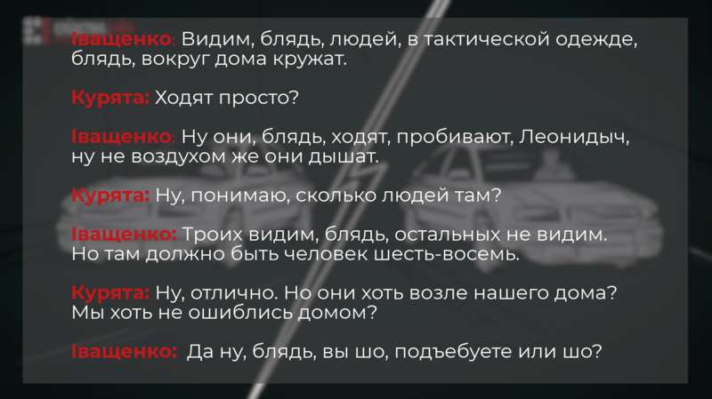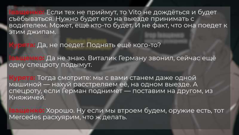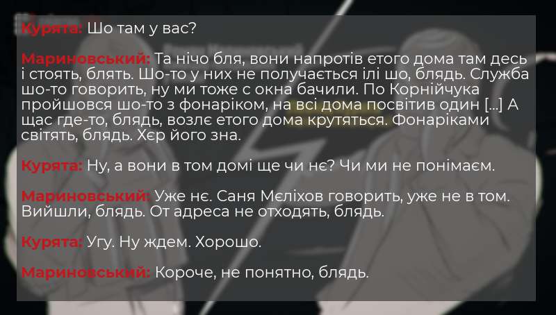 Судя по разговорам между руководителями операции, полицейские готовы были стрелять. Об этом ярко свидетельствует следующий разговор между Курятой и разведчиком Иващенко.
