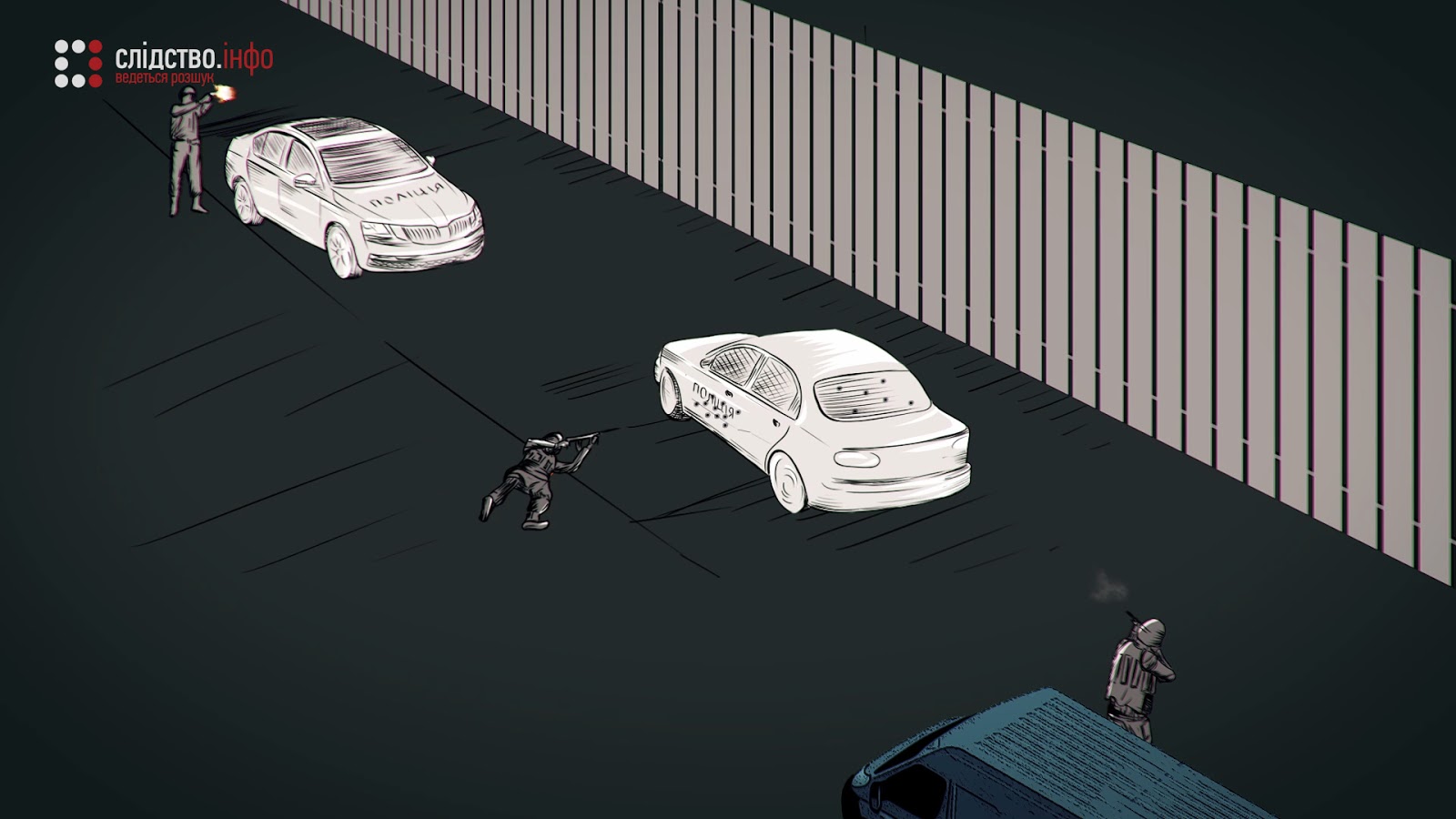Микроавтобус остановился в нескольких метрах позади полицейского «Ланоса», в котором двое охранников, а на заднем сиденье - задержанные разведчики. Неподалеку стояла вторая машина полицейского охраны - Skoda. Из передних дверей микроавтобуса выскочили спецназовцы КОРДа Валецкий и Курта. Валецкий подбежал к «Ланосу» и упал на левый бок у водительской двери. Началась стрельба. До сих пор неизвестно, что спровоцировало КОРДовца стрелять и за несколько секунд выпустить более 20 пуль в автомобиль, где было четверо правоохранителей. Экспертиза установила, что из салона «Ланоса» также стреляли, но неприцельно и пули ни в кого не попали.
