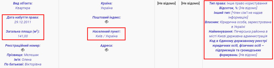 Згідно з майновою декларацією судді за 2017 рік суддя Мєлєшак разом із чоловіком проживає у службовій квартирі в столиці площею 141 кв. м.