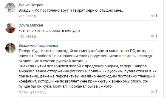 Множество гневных комментариев появилось в социальной сети Вконтакте под публикациями с новостью, в которой Лавров пообещал, что РФ не будет воевать с Украиной. Пользователи Вконтакте обвинили главу МИД РФ в том, что он “продался педосам” и обманул жителей псевдореспублик.