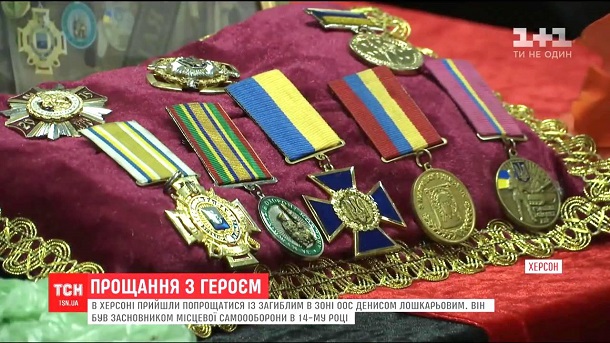 В среду, 19 декабря, в Херсоне простились с 39-летним младшим лейтенантом, командиром взвода снайперов батальона специального назначения “Донбасс” 15-го отдельного полка Национальной Гвардии Украины Денисом Лошкаревым (“Мол”), который погиб днем 15 декабря в районе поселка Гнутово Донецкой области в результате пули снайпера боевиков.
