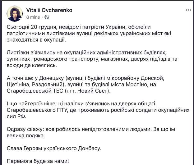 Он опубликовал соответствующее фото и написал, что листовки появились на захваченных административных зданиях, остановках общественного транспорта, магазинах, дверях подъездов. В комментарии он добавил6