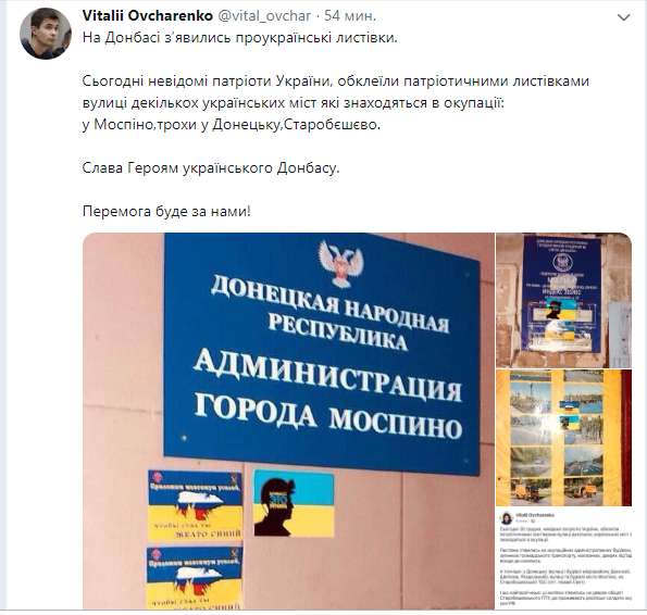 Сегодня неизвестные украинские патриоты обклеили патриотическими открытками улицы неподконтрольных Украине Донецка, Моспино и Старобешевскм районе. Об этом на своей странице в соцсети написал украинский активист Виталий Овчаренко.