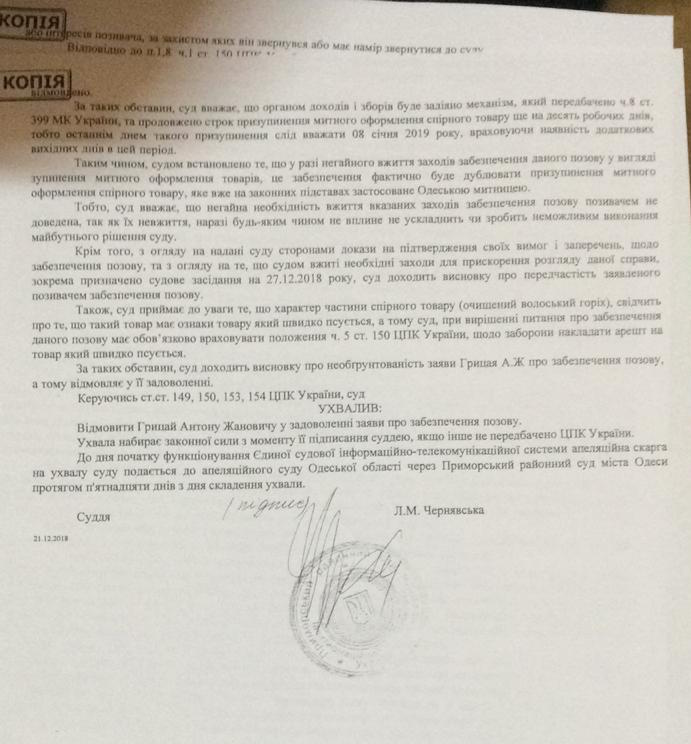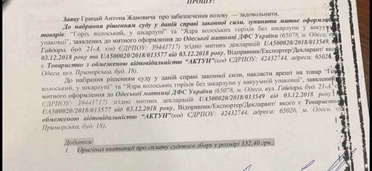 Проросійські контрабандисти Чорній та Грицай, яких підтримує в.о. начальника Одеської митниці Сергій Мартинов зовсім знахабніли та пішли до суду щоб заарештувати товар який належить ветеранам війни на Донбасі, хоча на сам товар – горіхи, в них патента не має.