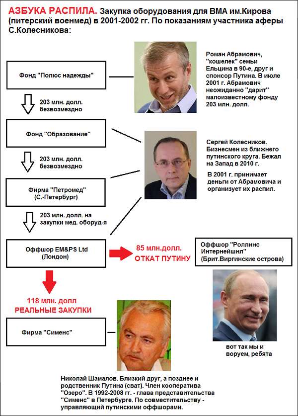 По законам Коза-Ностры любой "солдат" (рядовой мафиози) или "капо" (бригадир), добыв бабла, должен поделиться со старшим по иерархии, а тот – со своим старшим и т.д. Также наворованное внутри Коза-Ностры крайне редко оформляют лично на главаря, босса "семьи". Обычно — на подставных лиц, номиналов. Так работает мафия. Так работает путинское государство.