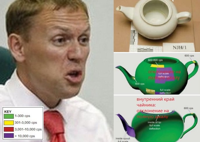 Внутри чайник так и светится радиацией – "отклонение на полную шкалу". Так же светился сифон под раковиной в гостиничном номере депутата Лугового. Траванув Литвиненко, перед отъездом он ссыпал остатки полония в канализацию. Адским образом светился также писсуар, куда ходил Луговой в баре, где он отравил Литвиненко (путинского киллера не предупредили, что вещество радиоактивно). Отклонение на полную шкалу, да. Как и весь чекизм-путинизм.