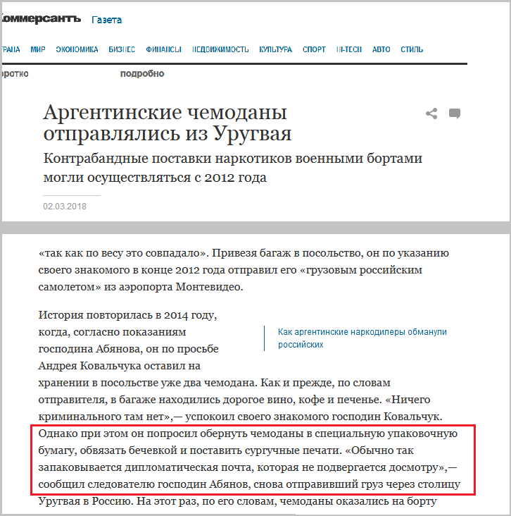 По официальной версии МИД РФ канал транзита кокаина в посольстве в Аргентине накрыл сам посол Виктор Коронелли в припадке честности. Узнал про чемоданы и (вместе с ФСБ) обратился в полицию. В эту официальную версию сложно поверить по ряду причин: