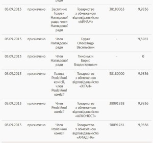 акціонериУ банківському повідомленні вказано, що заступником голови наглядової ради банку стало ТОВ «Айнам», а до ревізійної комісії ввійшли ще три компанії – ТОВ «Хіган», ТОВ «Алконост» і ТОВ «Амадіна». Кожна з цих чотирьох компаній має статутний капітал 1,71 млрд грн. і кожній з них належить по 9,98% акцій банку.