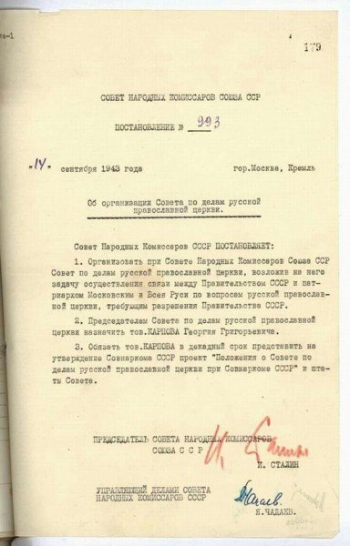Народный комиссариат государственной безопасности подписал бумаги об организации Совета по делам Русской православной церкви 9 сентября 1943 года.