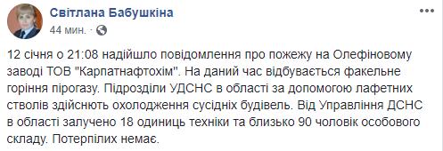 "В настоящее время происходит факельное горение пирогаза. Подразделения УГСЧС области с помощью лафетных стволов осуществляют охлаждение соседних зданий. От Управления ГСЧС в области привлечено 18 единиц техники и около 90 человек личного состава. Пострадавших нет", - рассказала пресс-секретарь управления ГСЧС в Ивано-Франковской области Светлана Бабушкина.