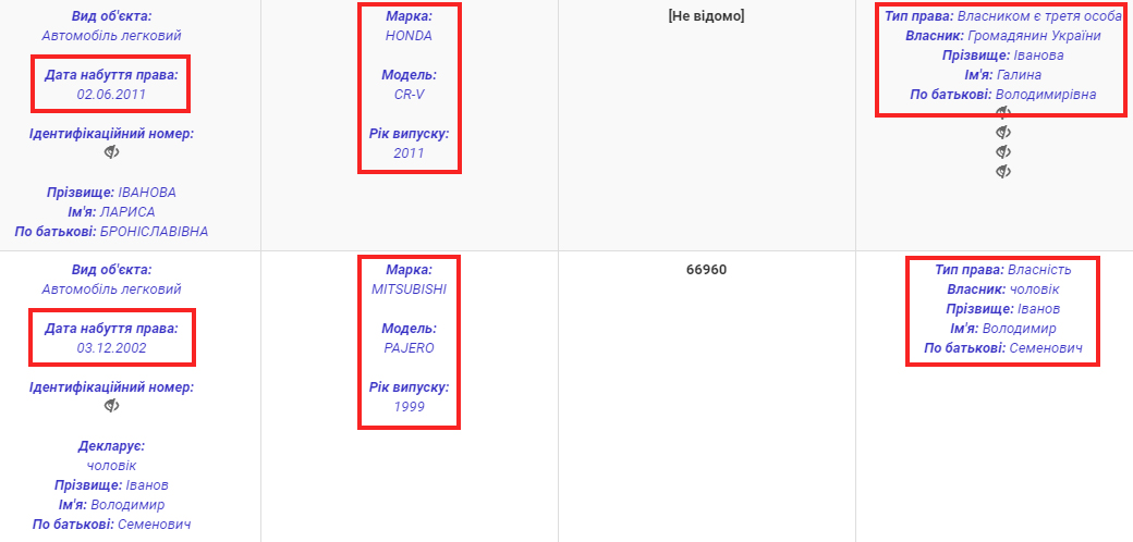 Лариса Іванова записала у свою декларацію про доходи чоловіковий Mitsubishi Pajero та доньчин HONDA CR-V 2011 року випуску, яким сама і користується. Кросовер – власність Галини Іванової, вона приватний нотаріус. У мережі такий автомобіль-одноліток продають за 450 000 грн з пробігом 89 тис. км. Згідно з відомостями податкової це трохи більше офіційного доходу Галини Володимирівни у період з 2012 по 2016 рік.
