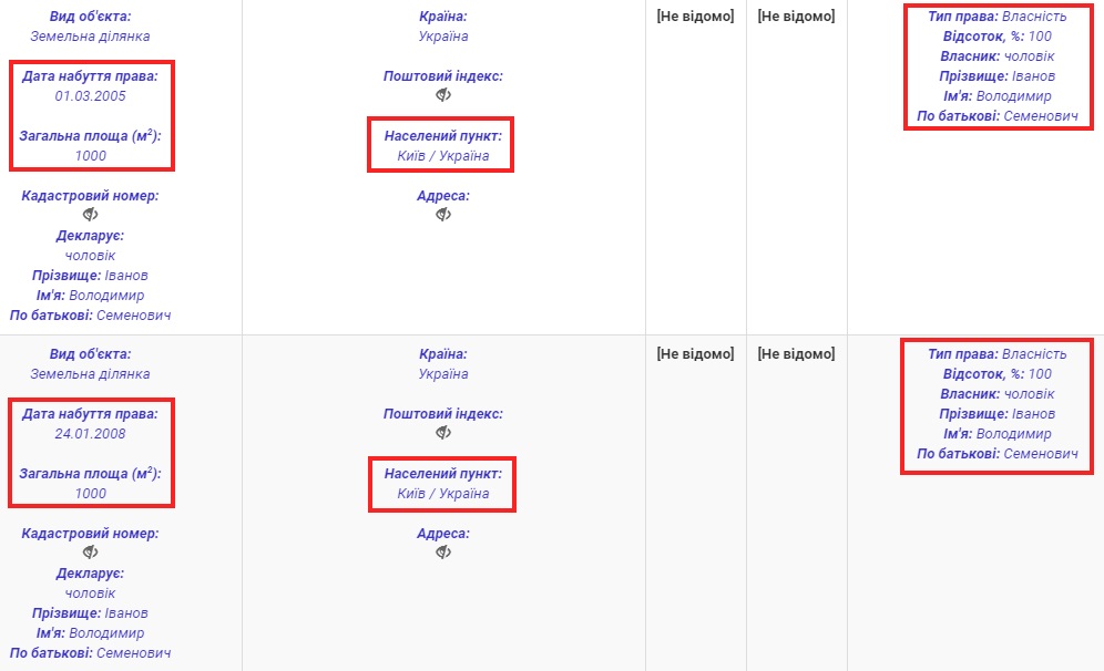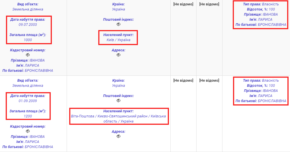 Лариса Іванова з чоловіком Володимиром мають по дві земельні ділянки в межах Києва та Києво-Святошинського району. Всі наділи набуті уже в період суддівства, а деякі з них – безоплатно. За даними ГРД, суддя має принаймні дві приватизовані ділянки, а це викликає сумнів стосовно дотримання нею окремих статей Земельного кодексу.
