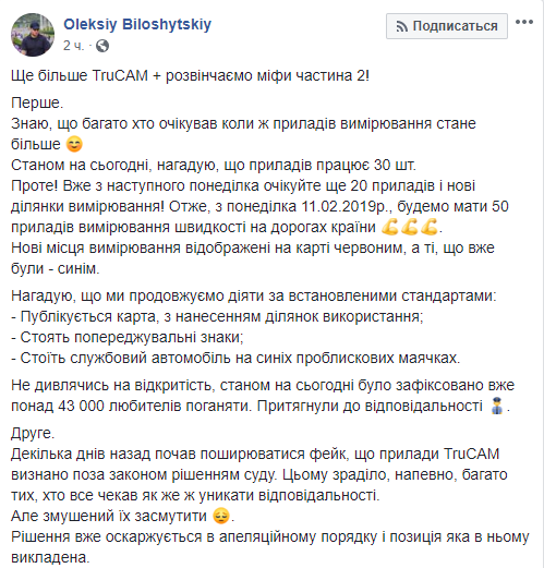 Также Белошицкий опроверг информацию о том, что использование приборов TruCam является незаконным, согласно решению суда.