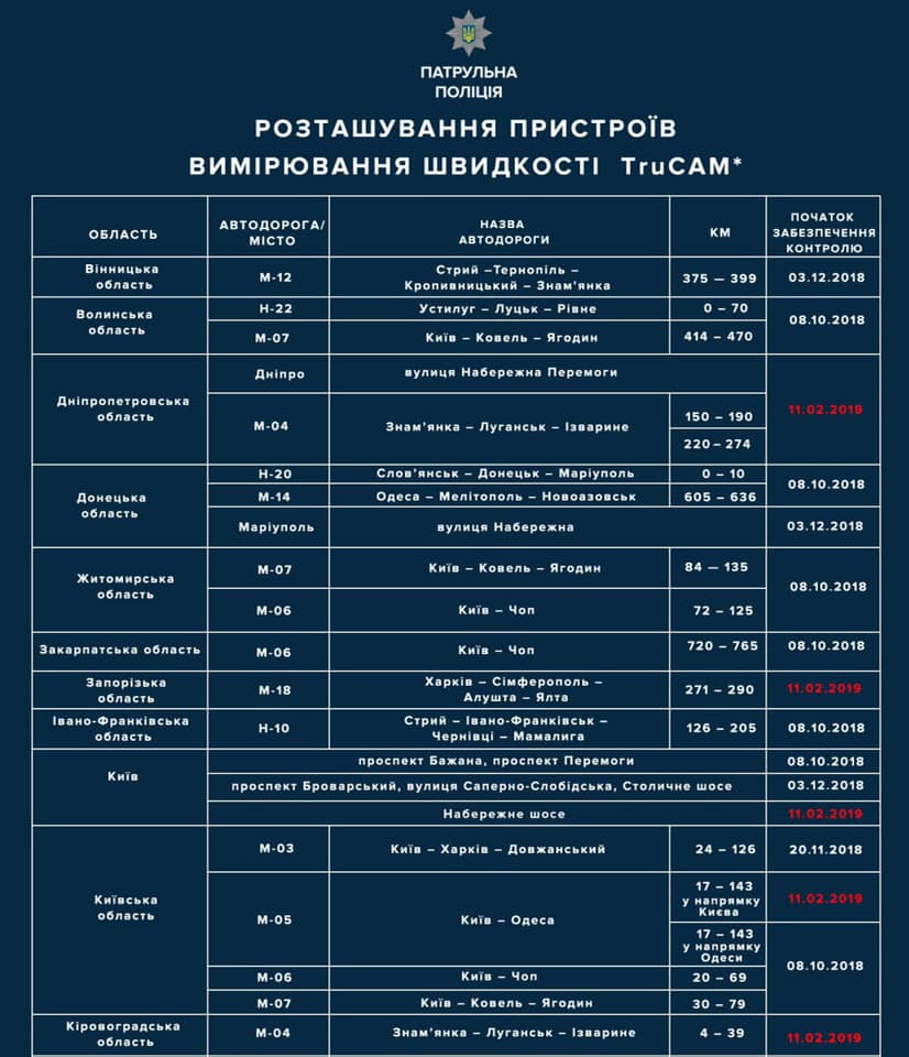Количество радаров для измерения скорости TruCam в Украине увеличится почти вдвое с 11 февраля 2019 года. Об этом сообщил первый заместитель начальника департамента патрульной полиции Алексей Билошицкий на странице в Facebook.