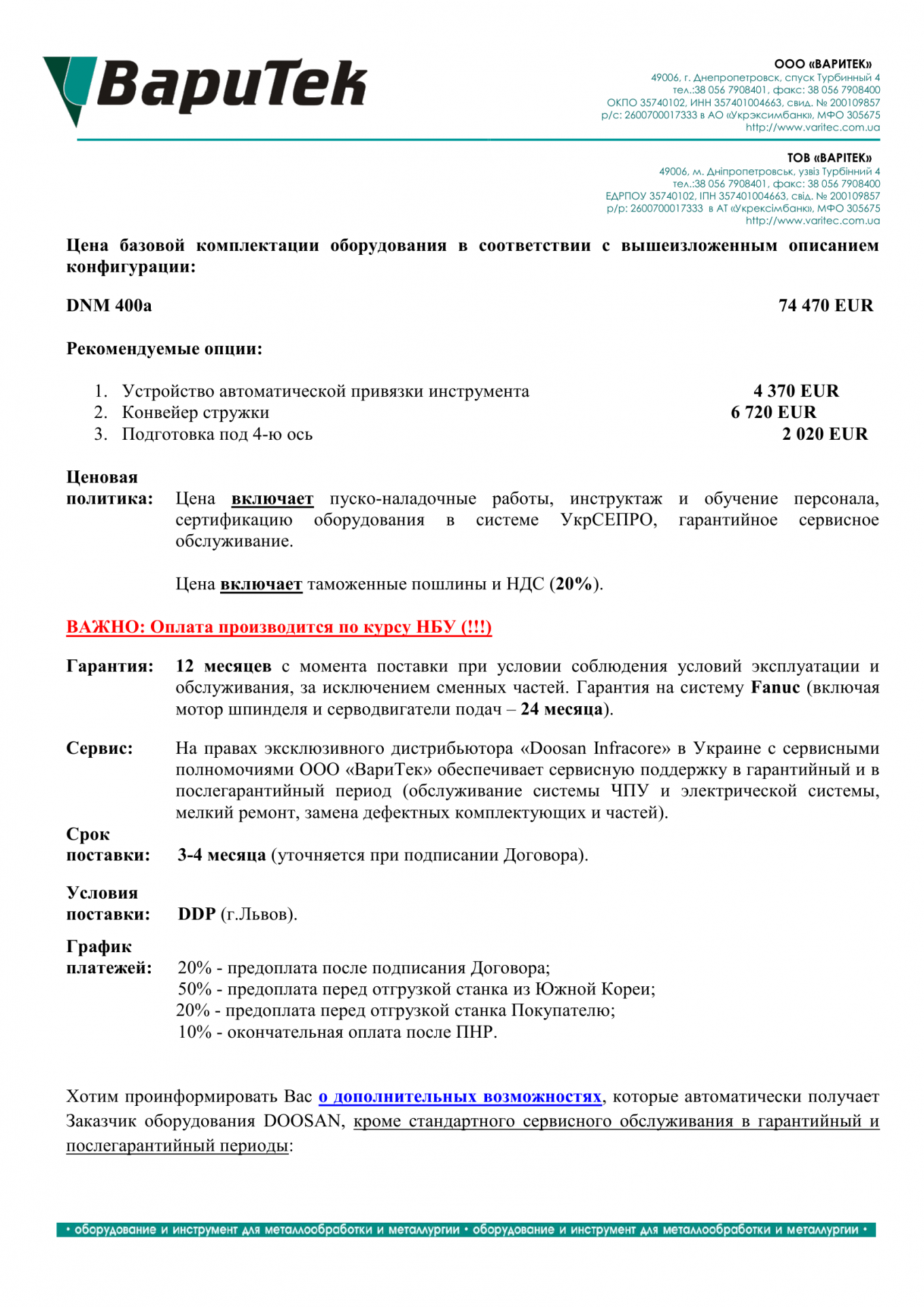 Среди станков были четыре вертикальных обрабатывающих центры DNM 400a по 5,15 млн грн. за каждый, что на дату подписания договора равнялось 163 тыс евро или $ 186 тыс.