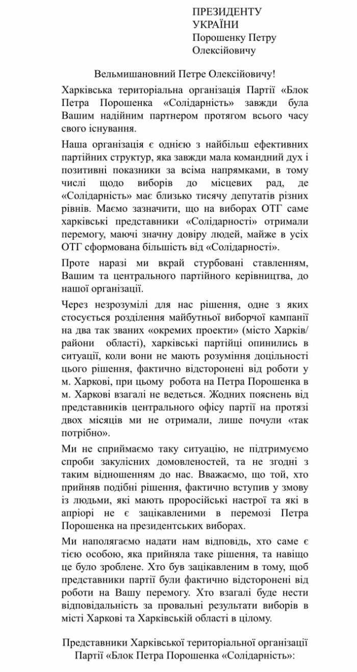 Сначала на Банковую пришел неожиданный письмо. Подписан он был 600 харьковскими партийцами БПП. Суть письма сводилась к тому, что "рядовые члены партии" возмущались, что избирательный процесс в области и самом Харькове разделили, и выборы в областном центре отдали "пророссийским элементам".