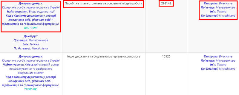 Ми проаналізували оприлюднені у відкритому доступі декларації Тетяни Малашенкової за 2014, 2015, 2016 та 2017 роки. Членкиня Вищої ради правосуддя отримує велику заробітну плату. Лише за 2017 році їй виплатили 2,8 млн грн та 8600 соціальної допомоги. Її чоловік, що працює у лікарні «Феофанія» Держуправління справами, приніс сімейному бюджету 386 758 грн. Додатково родина продала батьку Малашенкову Михайлу автомобіль і заробила на цьому 446 651 грн.