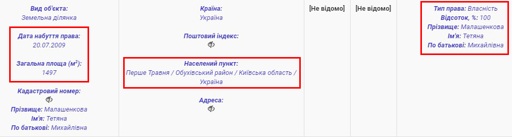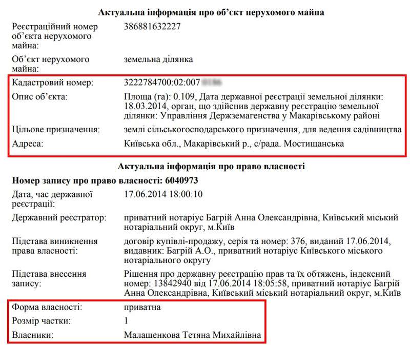 Цікаво, що земельну ділянку у с. Перше Травня, Обухівського району вона набула безплатно, а сусідні земельні ділянки належать співзасновнику її компанії Багрію К. В та його родичці Багрій Л. А. Схеми «безкоштовного» отримання землі біля Києва завжди були «брудними». Дуже схоже, що ці ділянки отримані внаслідок саме таких схем.