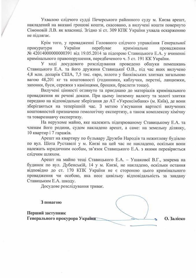 Тоді ж у березні на всю країну показали, як були конфісковані мільйони доларів готівкою та десятки кілограмів золота і коштовностей у помешканні екс-міністра ПЕК Едуарда Ставицького, котрий склав компанію Миколі Присяжнюку у переховуванні від слідства. Уже скерував відповідний запит до Генпрокуратури щодо долі цих вилучених скарбів. Не здивуюся, що рішенням ще якогось слідчого судді (за мовчазної згоди слідчих) і ці гроші було повернуто куму, свату чи брату цього злочинця. Про це дізнаємося дуже скоро. А на цю ухвалу Печерського райсуду свою відповідь ми дамо вже на найближчому засіданні Комітету.