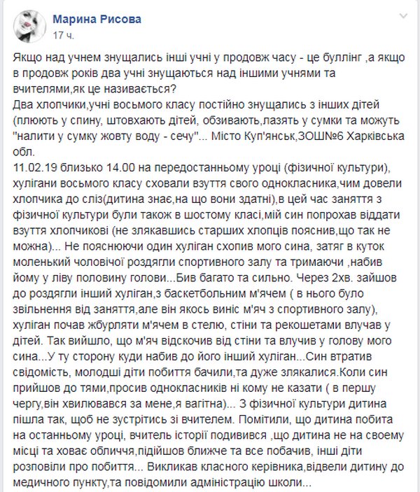 Она рассказала случай, который произошел в школе 11 февраля, когда обидчики издевались над своим одноклассником, забрав его обувь на уроке физкультуры. За старшего вступился шестиклассник (сын Рисовой), которого мальчишки избили по голове. Ребенок потерял сознание. У мальчика левая сторона лица была распухшая. Левого глаза не было видно. Ребенка лечили в травматологическом отделении местной больницы. Однако после больницы ему не стало лучше. У него диагностировали отек левой половины лица, внутреннюю черепную гипертензию и другие нарушения.