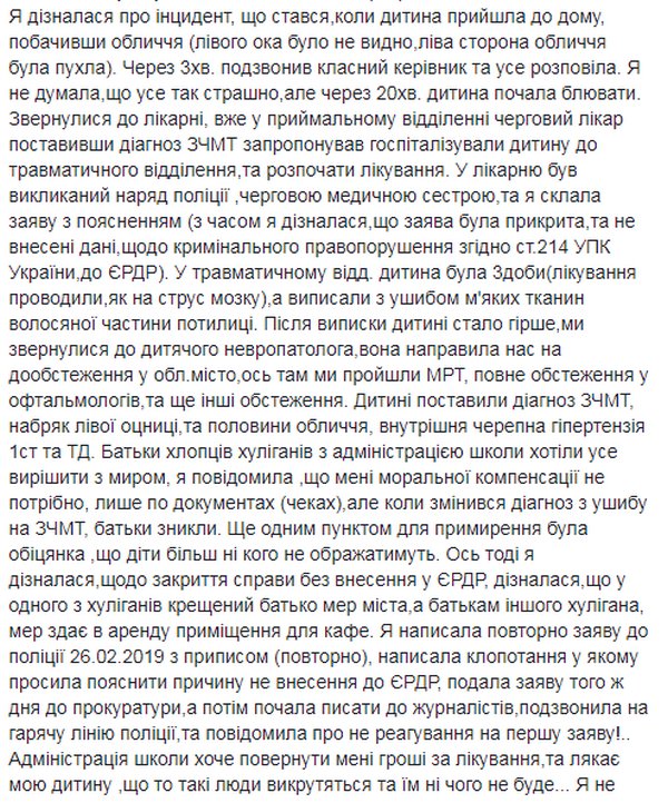 Якобы родители обещали, что дети больше никого не будут обижать. Женщина хотела наказать обидчиков, обратившись в полицию, но, как оказалось, ее заявление не внесли в Единый реестр досудебного расследования. По ее словам, случилось это из-за связей родственников мальчишек-обидчиков с руководством города.
