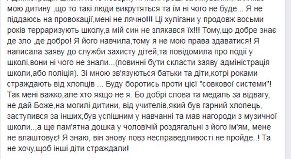 «Администрация школы хочет вернуть мне деньги за лечение, и пугает моего ребенка, что это такие люди выкрутятся и им ничего не будет … Я не поддаюсь на провокации, мне не страшно. Со мной связываются родители и дети, которые годами страдают от ребят … Буду бороться против этой „совковой системы“… не хочу, чтобы другие дети страдали!», — заключает она.