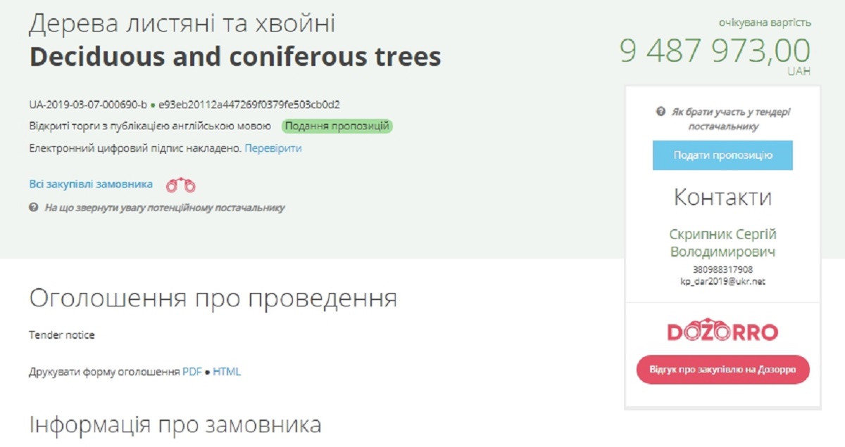 Кроме этого, 13 мая пройдет аукцион в тендере на закупку 2 299 саженцев дарницким коммунальным предприятием. На это планируется потратить до 9 млн 487 тыс. 973 грн.
