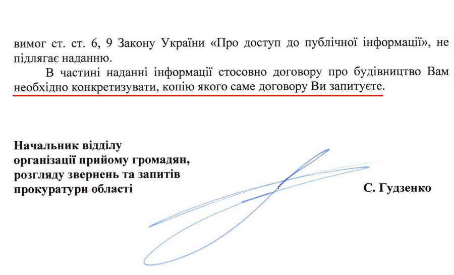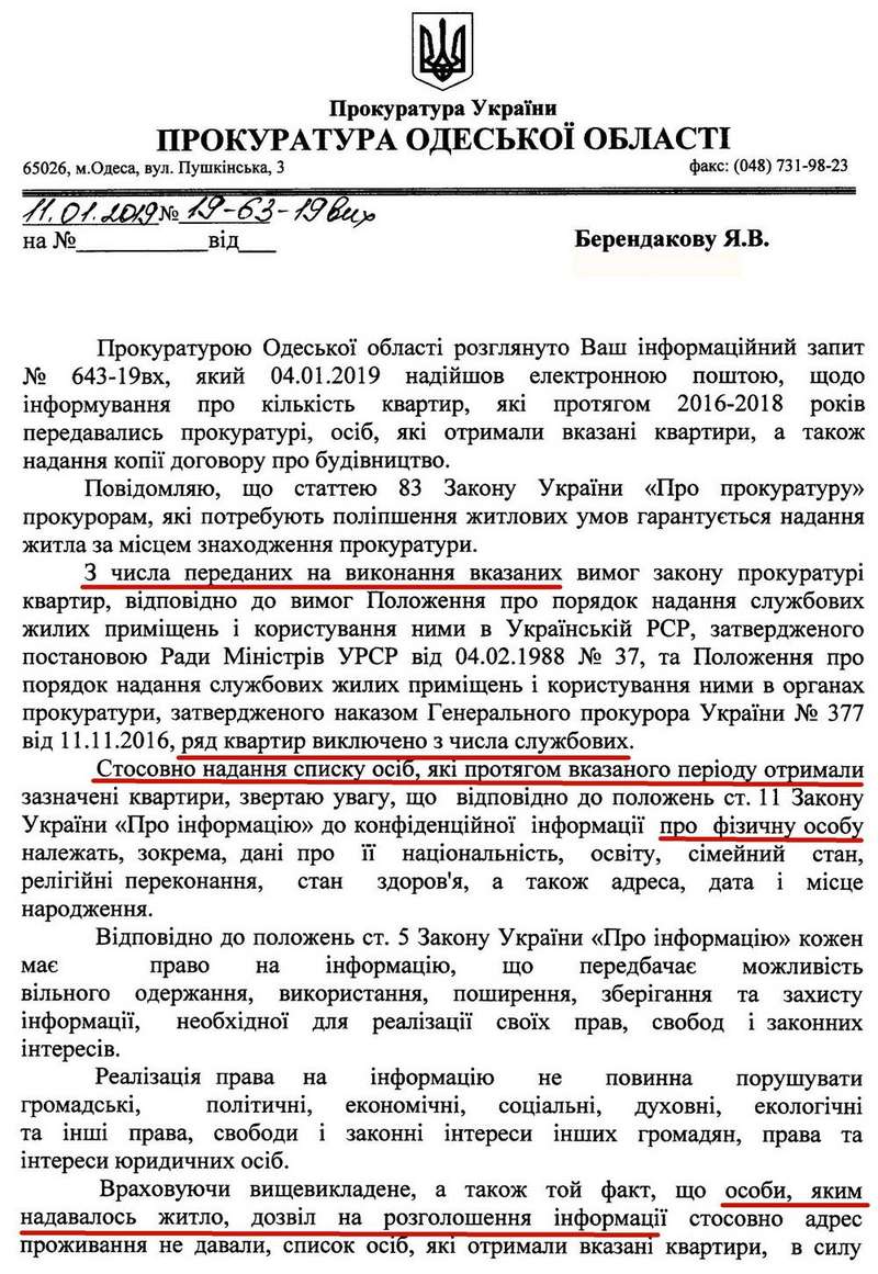 Тем не менее, список сотрудников прокуратуры, которые получили от «Стикона» и «Будовы» квартиры, прокуратура Одесской области отказалась предоставлять, ссылаясь не на ту норму законодательства, а именно на то, что информация об адресе проживания физических лиц является персональной информацией, согласие на разглашение коей прокуроры якобы не давали. В то же время журналист запрашивал список сотрудников, которые получали квартиры, без указания адреса, то есть иную информацию.