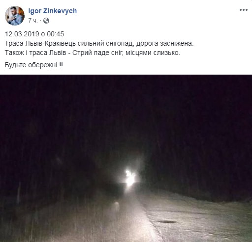 “Трасса Львов-Краковец сильный снегопад, дорога заснеженная. Также и трасса Львов-Стрый падает снег, местами скользко. Будьте осторожны”, – написал добавил Зинкевич.