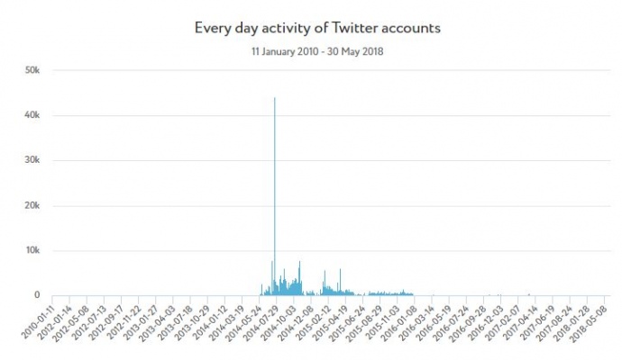 Журналісти дослідили інформаційні атаки російської «фабрики тролів» на Україну, починаючи з 2010 року. Виявилось, що до анексії Криму Україна майже не цікавила ботів. Вони активізувалися в період виборів президента у травні 2014 року.