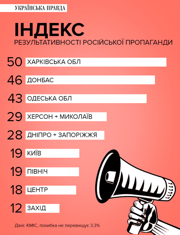 Ще у 2015 році Київський міжнародний інститут соціології вивів «індекс результативності російської пропаганди» в Україні. Найбільше кремлівські інформаційні фейки впливають на мешканців Харківської області, Донбасу та Одеської області.