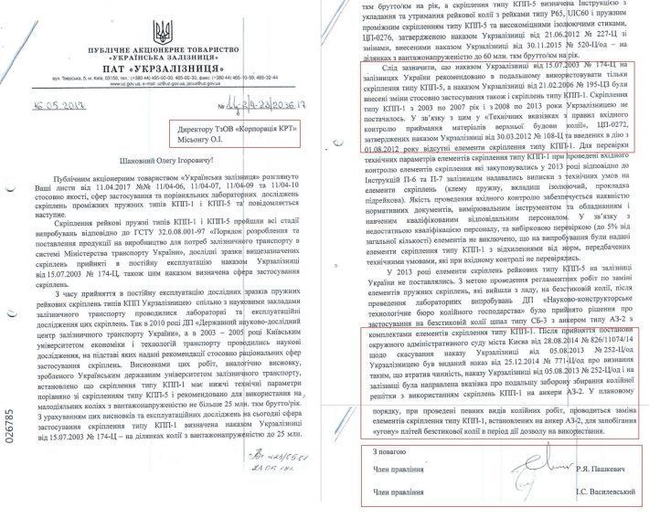 Щоправда згідно експертизи НАБУ, саме рейкові кріплення КПП-5 виробництва ТОВ “Корпорації КРТ” не відповідають вимогам та не забезпечують необхідне мінімальне притискне зусилля рейки в 25кН. Отже чия продукція насправді краща і безпечніша – нам лишається тільки здогадуватись.