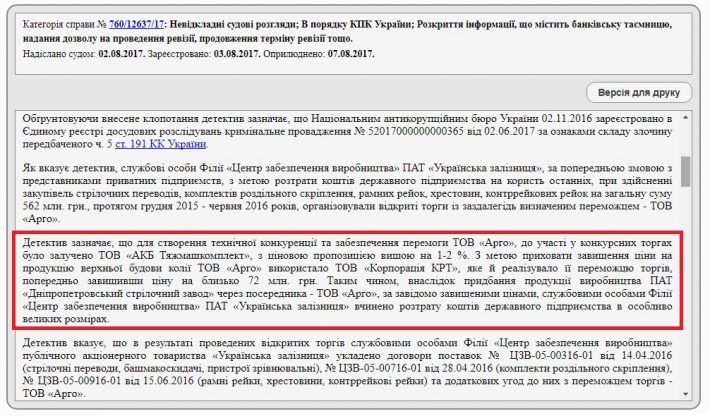 “Таким чином, внаслідок придбання продукції виробництва ПАТ «Дніпропетровський стрілочний завод» через посередника – ТОВ «Арго», за завідомо завищеними цінами, службовими особами Філії «Центр забезпечення виробництва» ПАТ «Українська залізниця» вчинено розтрату коштів державного підприємства в особливо великих розмірах” – йдеться в матеріалах слідства.