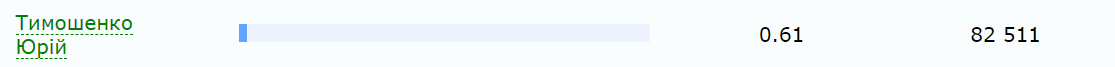 По информации со всех 199 избирательных округов в Украине, за кандидата в президенты Украины Тимошенко Юрия Владимировича отдали голоса 0,61% избирателей (а это 82 511 тысяч человек). Отметим, за Юлию Тимошенко свои голоса отдали 13,8% избирателей (1,78 млн. украинцев).