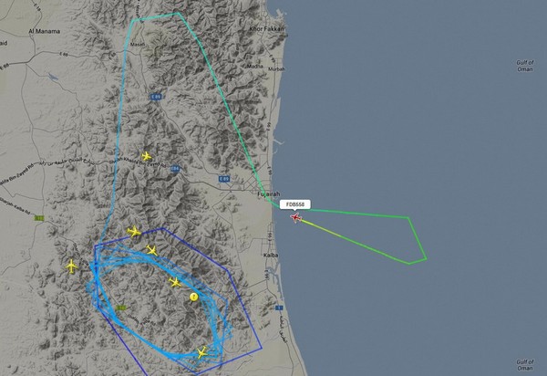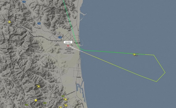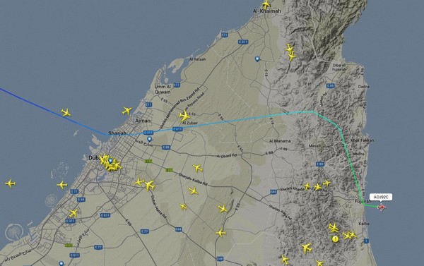 UPD 7: Итак, самолет таки сел на восточном побережье в Fujairah Intenational Airport. Не исключено что для дозаправки, так как топлива у него теоретически оставалось не много.