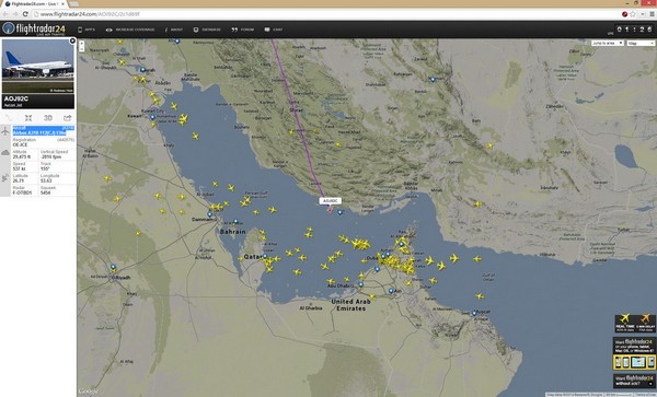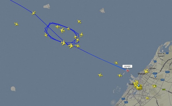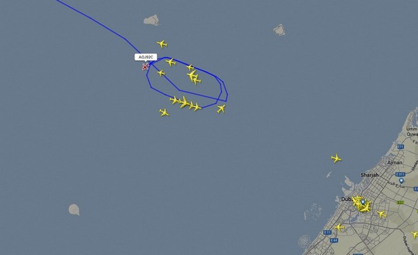 UPD2: Самолет продолжает наматывать круги, на посадку в Дубай небольшая пробка. Максимальная дальность полета у этого самолета при полных баках топлива примерно 6000 км, на данный момент самолет преодолел почти 4000 км. Еще пару часиков такого хоровода, и овощ окунется в Персидский залив.