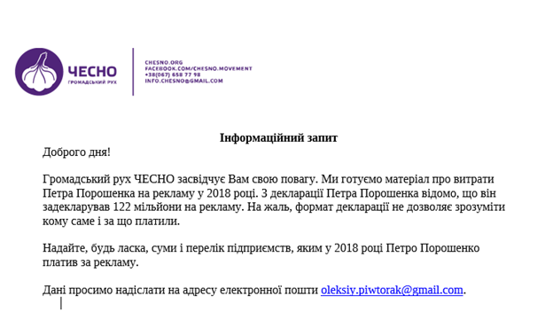 Сообщается, что в декларации за 2018 год Петр Порошенко указал 122 миллионов грн расходов на рекламу. Но, по подсчетам активистов, только на телерекламу он потратил 175 миллионов грн, а расходы на наружную рекламу и агитацию в социальной сети Facebook вообще не указаны в декларации.