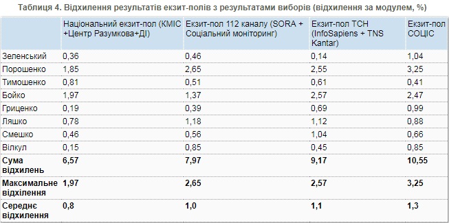 Розрахунки КМІСу демонструють, що у першому турі президентських виборів прогнози екзит-полів були доволі точними щодо результатів голосування за Володимира Зеленського, Юлії Тимошенко, Анатолія Гриценка, Ігоря Смешка і Олександра Вілкула. Найбільш хибними такі прогнози виявилися щодо результатів Петра Порошенка і Юрія Бойка.