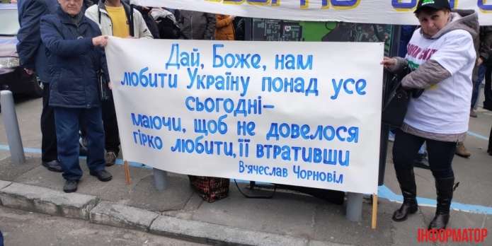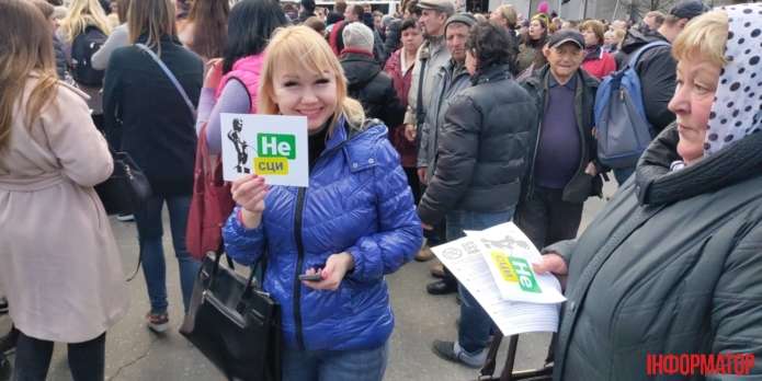Про це з місця події повідомляє кореспондент видання ІНФОРМАТОР. Головні убори з написами «STOP ZE» і «НЕ СЦИ!» роздають активісти громадської організації «Відсіч».