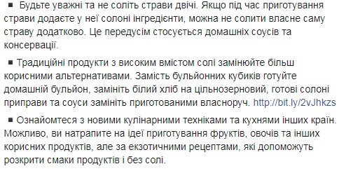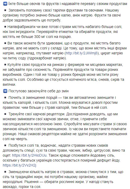 Она отметила, что каждый день украинцы потребляют большое количество соли, даже не замечая этого. Она утверждает, что в мире больше всего людей убивает не курение и высокое давление, а неполноценное питание и много соли.