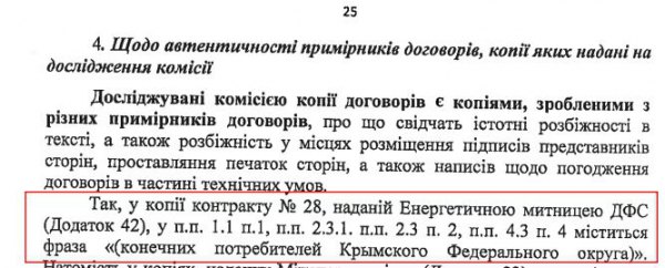 В копии документа, предоставленном таможней, неоднократно упоминается о том, что поставки электроэнергии осуществляется до конечных потребителей «Крымского федерального округа», а в копиях, предоставленных министром Демчишиным, эта фраза отсутствует (уголовная преступление — «служебный подлог» — А).