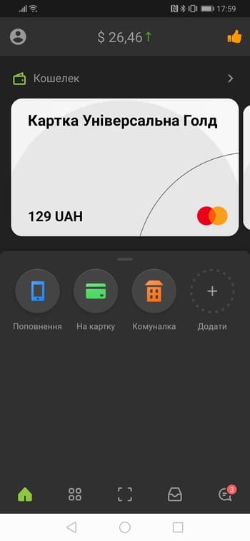 Головний екран Приват24 показує доступні карти, а також меню швидких дій, через які можна поповнити рахунок мобільного, перевести гроші на карту, оплатити комунальні послуги, тощо.