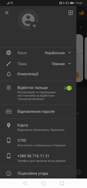 Якщо потягнути головний екран від лівого краю, відкриється меню зі швидкими налаштуваннями. У ньому можна вибрати мову, тему оформлення, відкриття програми через відбиток пальців, відновити пароль, знайти відділення банку або зателефонувати на підтримку. В українській версії зустрічаються написи російською мовою. Найближчим часом розробники виправлять цю проблему.